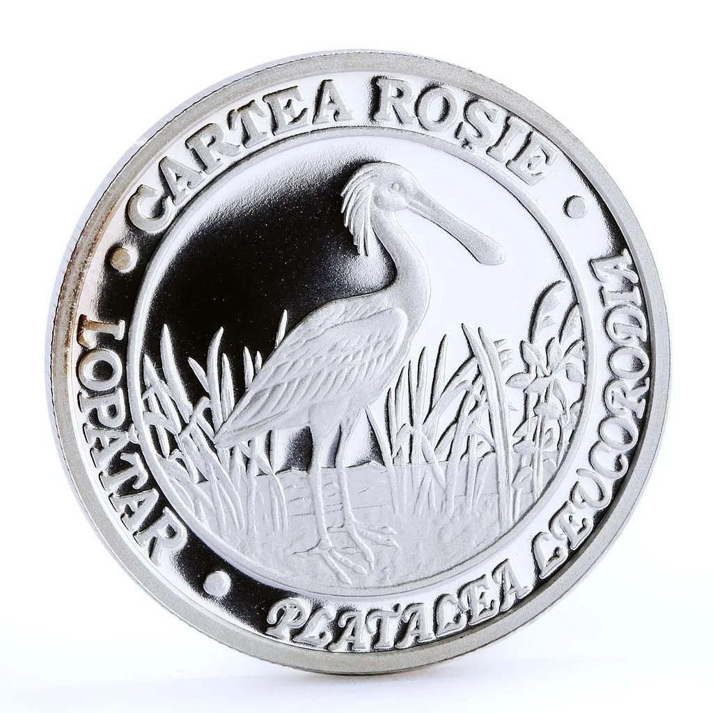 Description: Central: a spoonbill on a vegetable background. Around the edge, block letters read: “CARTEA ROŞIE", "LOPĂTAR", "PLATALEA LEUCORODIA”.