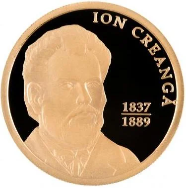 Center: Ion Creangă's head with "1837-1889". Right circumference: the inscription "ION CREANGĂ" in block letters.