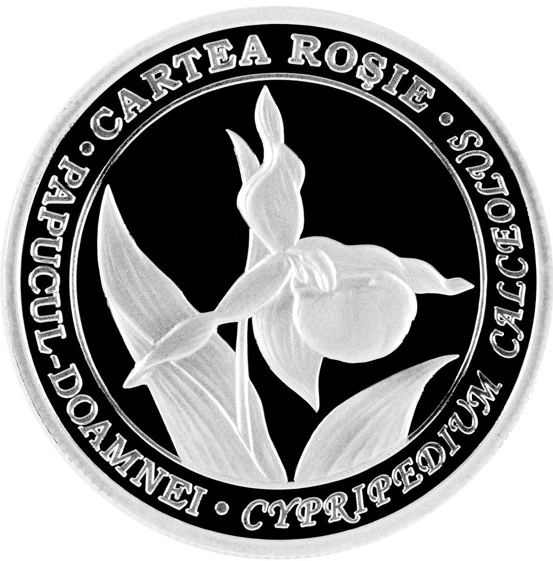 Description: Central: an orchid species. Around the edge: block letter inscriptions "CARTEA ROŞIE", "PAPUCUL-DOAMNEI", "CYPRIPEDIUM CALCEOLUS".