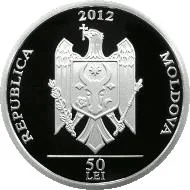 Central: Coat of Arms of Moldova. Top: year "2012". Bottom: "50 LEI". Circumference: "REPUBLICA MOLDOVA" in block letters.