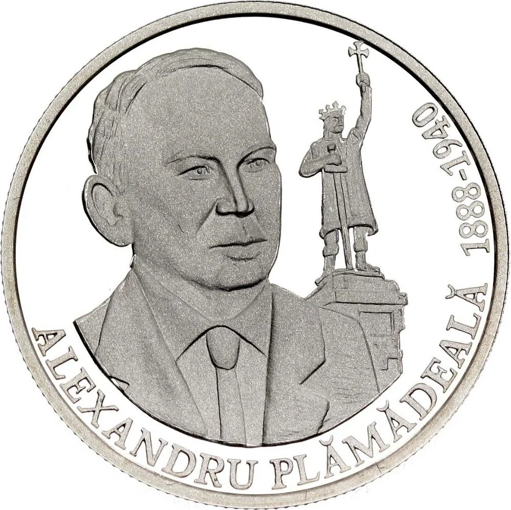 Description: Central: Alexandru Plămădeală's head and the monument to Ştefan cel Mare. Circumference: the inscription "ALEXANDRU PLĂMĂDEALĂ" and years "1888 - 1940".