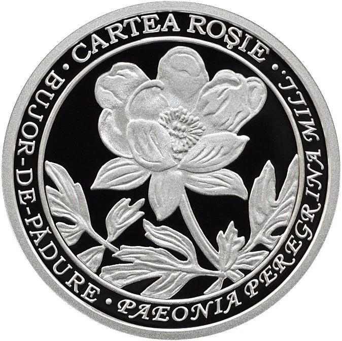Description: Center: Paeonia Peregrina. Around the edge: engraved block letters reading "CARTEA ROȘIE," "BUJORUL-DE-PĂDURE," "PAEONIA PEREGRINA MILL."