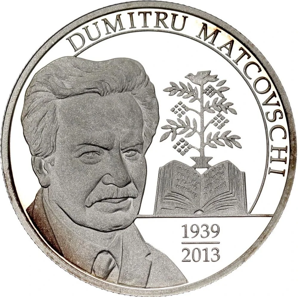 Central: Dumitru Matcovschi's head, a stylized tree of life, and a book. Top arc: "DUMITRU MATCOVSCHI". Bottom arc: life years "1939-2013".