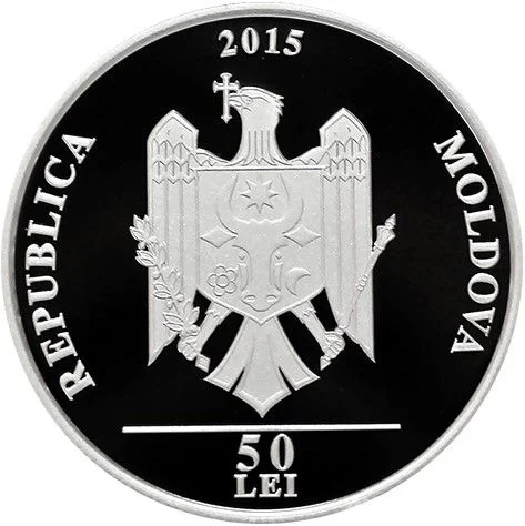 Central: Coat of Arms of Moldova. Top: year "2015". Bottom: "50 LEI". Circumference: "REPUBLICA MOLDOVA" in block letters.