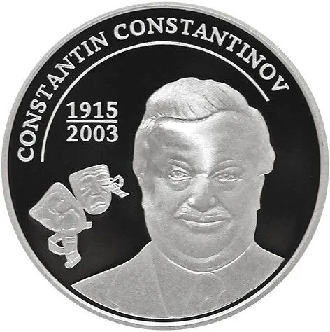 Central: Constantin Constantinov's bust and two theatre masks; left: life years "1915-2003"; above, around the ring: "CONSTANTIN CONSTANTINOV" in block letters.