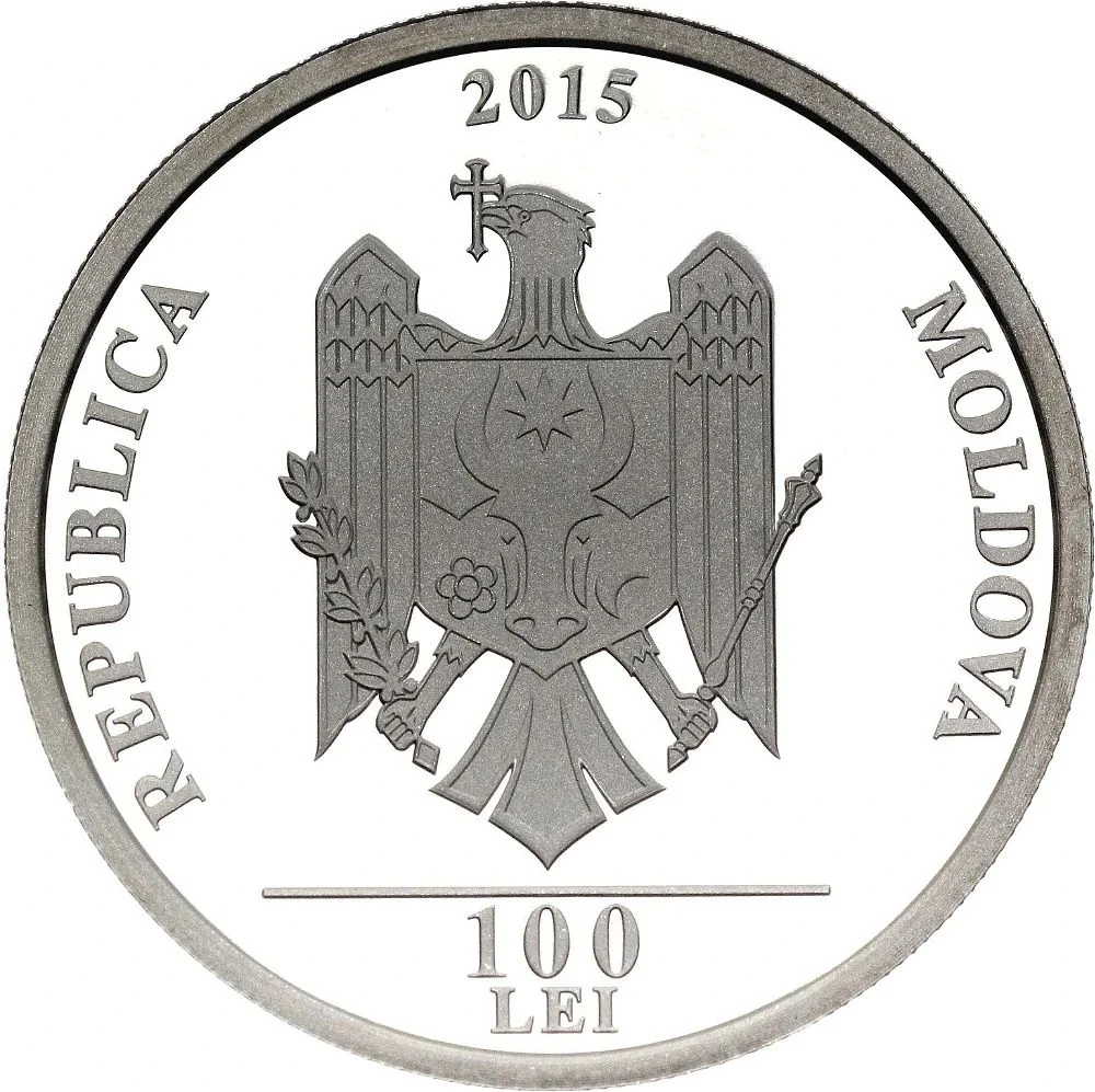 Central: Coat of Arms of Moldova. Top: year "2015". Bottom: "100 LEI". Circumference: "REPUBLICA MOLDOVA" in block letters.