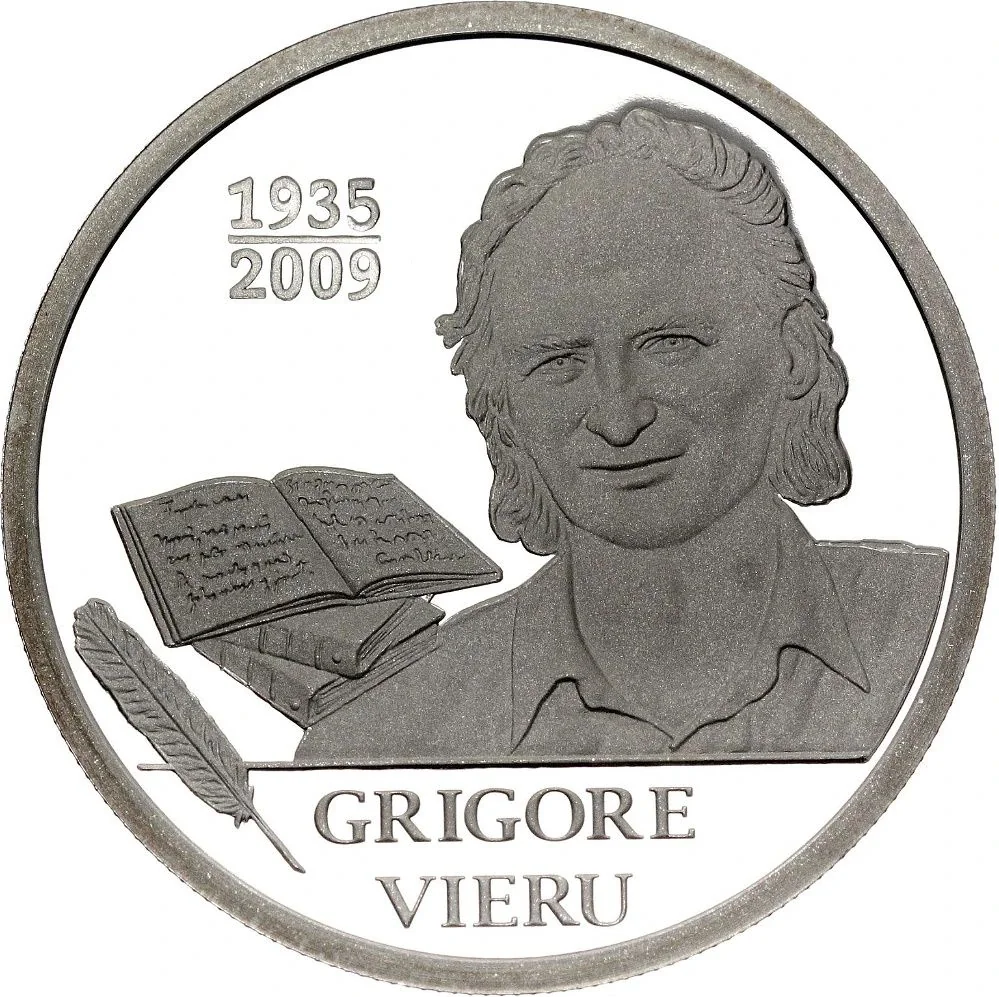 Central: bust of Grigore Vieru, three books (one open), and a quill. Left: life years "1935-2009". Below: engraved name "GRIGORE VIERU" in block letters.