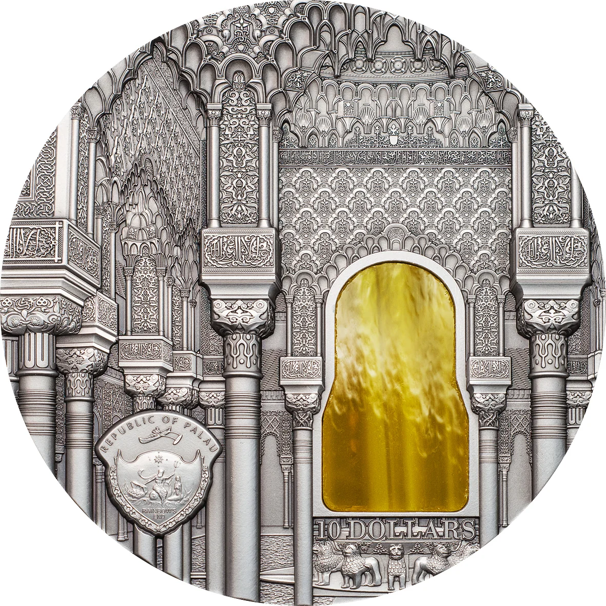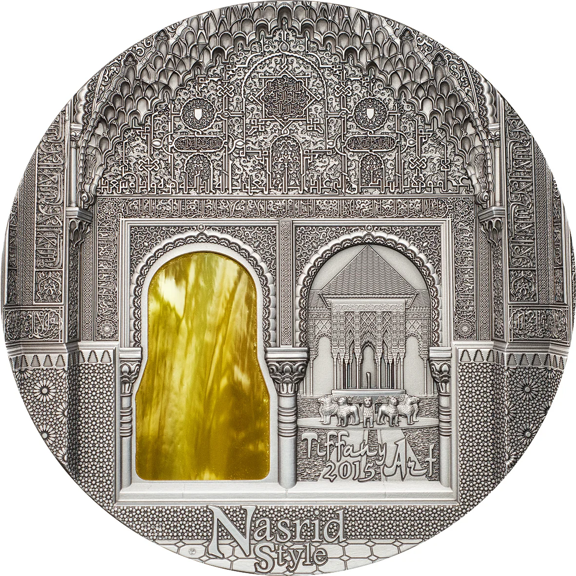 Nasrid-style Alhambra Palace in Granada with yellow stained glass.