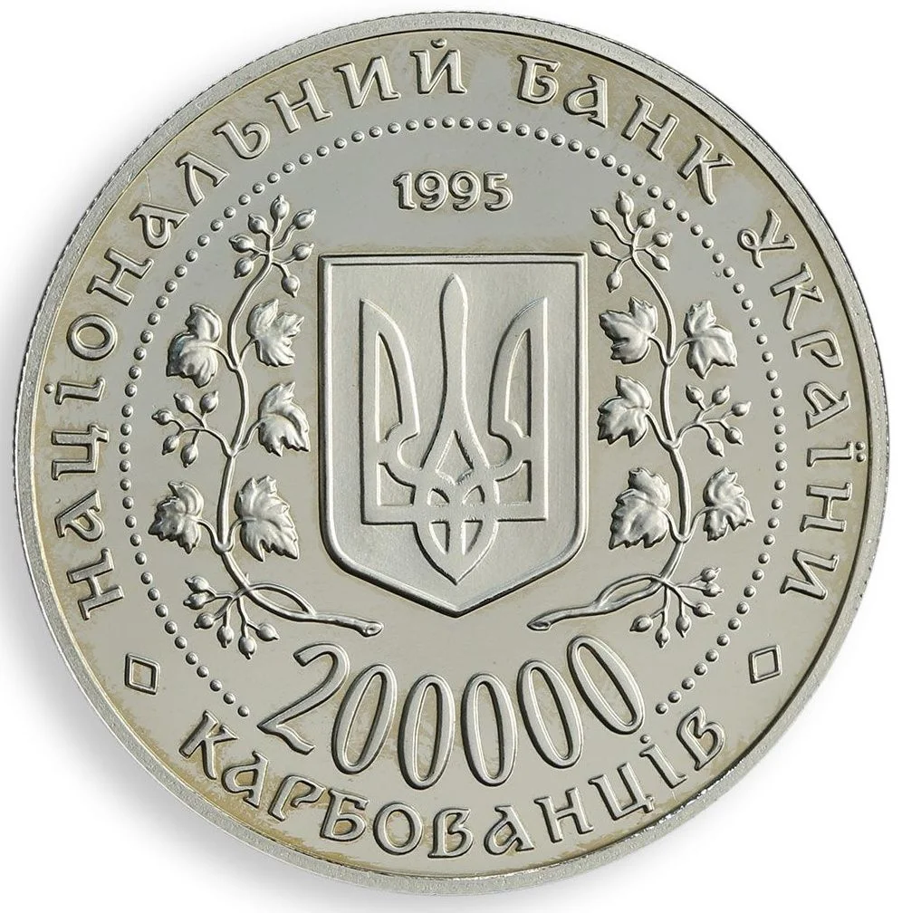Description: The Small State Emblem of Ukraine is centered within a beaded circle, framed by guelder-rose sprays. Each spray has five leaves and three berry clusters: the top cluster has seven berries, the middle five, and the bottom six. Above the emblem is the year "1995." Below it is the face value, "200000 КАРБОВАНЦІВ," with the number interrupted by the beaded circle. Around the circumference, the inscription "НАЦІОНАЛЬНИЙ БАНК УКРАЇНИ" is separated from "КАРБОВАНЦІВ" by rhombic marks.