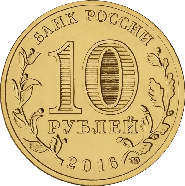The obverse features the circumferential inscriptions "БАНК РОССИИ" (top) and "2016" (bottom), with stylized laurel (left) and oak (right) branches. The central disc displays the face value "10 РУБЛЕЙ". Inside the '0' is a hidden protective element showing "10" and "РУБ" when tilted. The mint mark is at the bottom.
