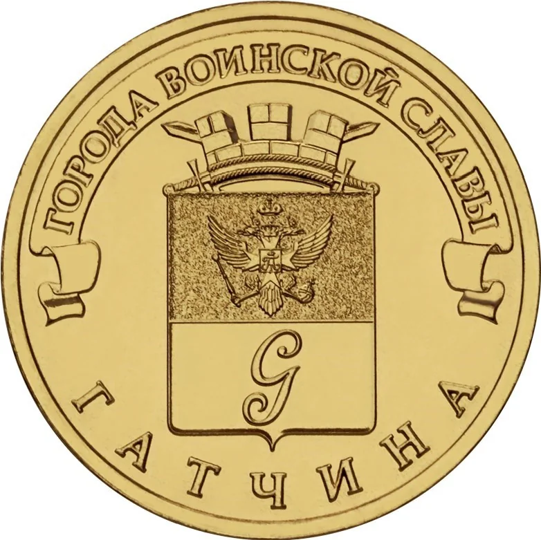 The reverse features Gatchina's emblem, encircled by "ГОРОДА ВОИНСКОЙ СЛАВЫ" above and "ГАТЧИНА" below.