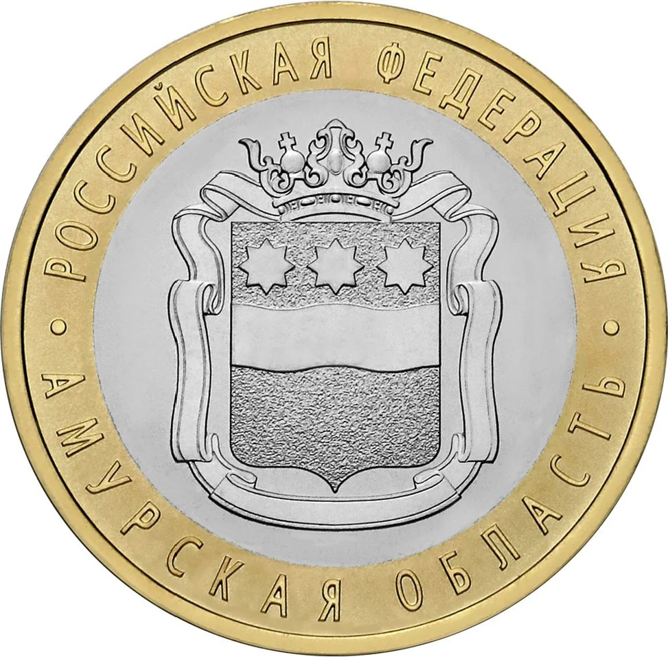 The reverse features the Belgorod Region's emblem on the disc, encircled by the inscriptions "РОССИЙСКАЯ ФЕДЕРАЦИЯ" above and "АМУРСКАЯ ОБЛАСТЬ" below.