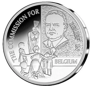 A portrait of Herbert Hoover beside a scene of Belgian food distribution.