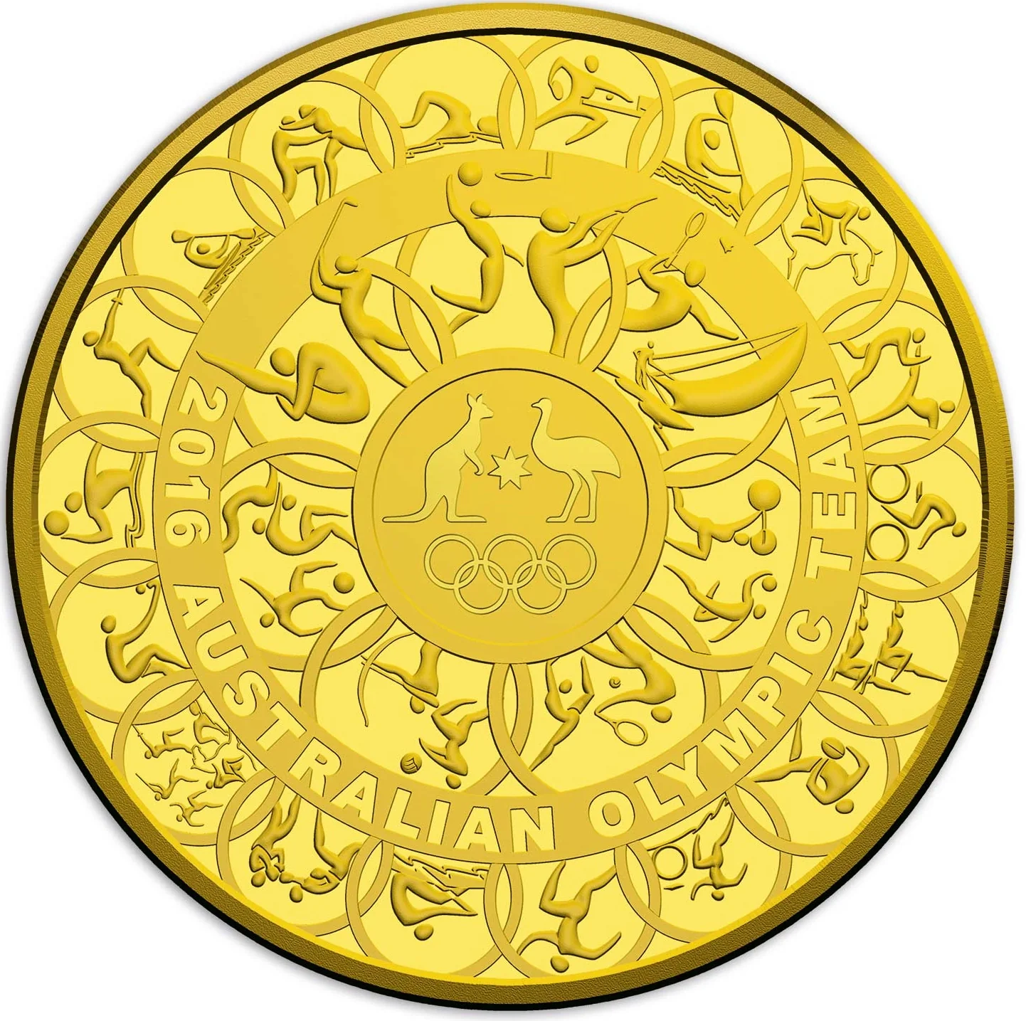 Kangaroo and emu flank a seven-pointed star and Olympic rings. The inner ring shows 14 sports; the outer ring, 18.