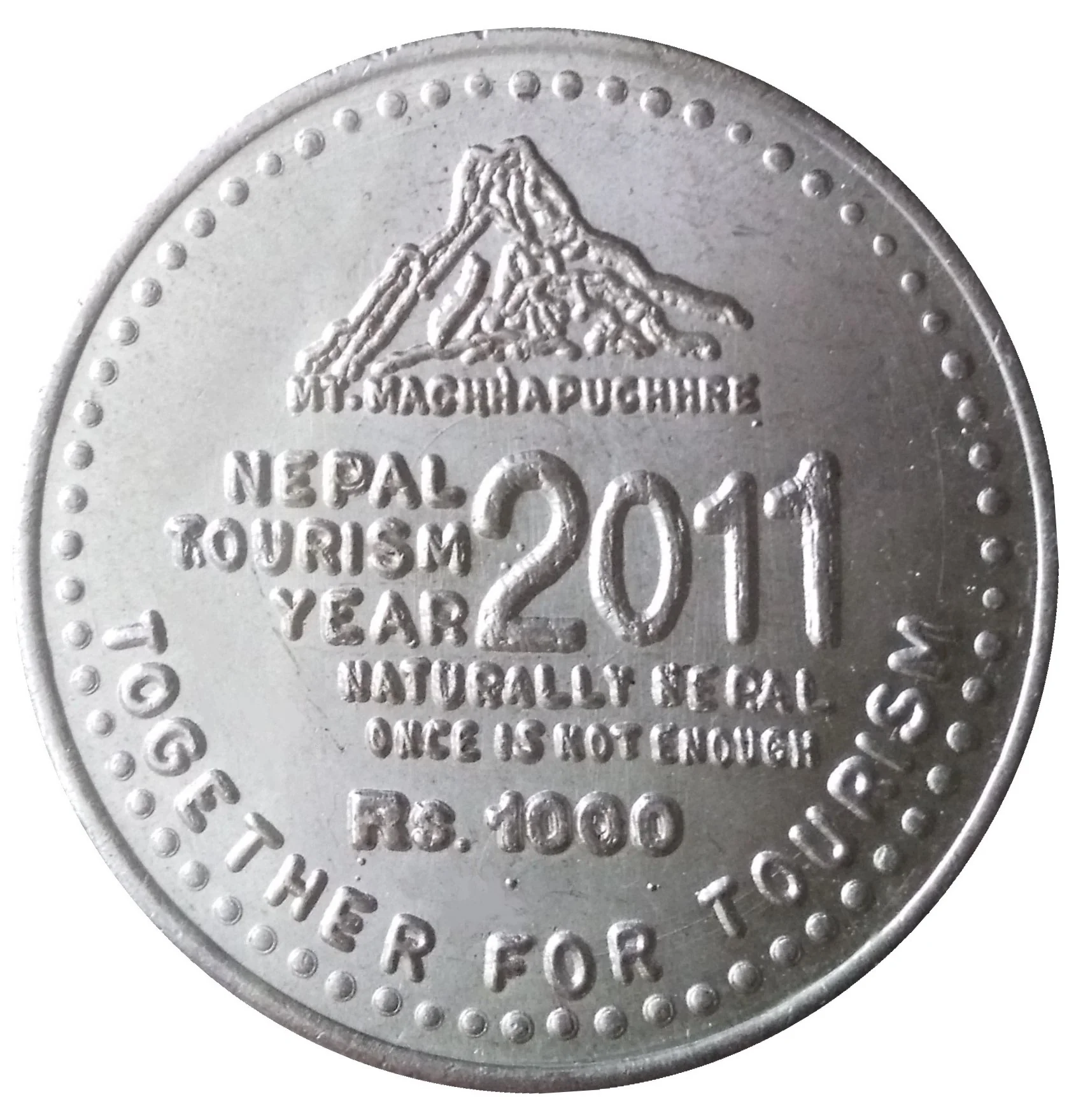 Description: Engraved Mountain Machhapuchhre with lettering below.
