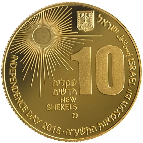 Israel State Emblem, "Israel" in English, Hebrew, and Arabic, mint year, and a decorative sun with rays.