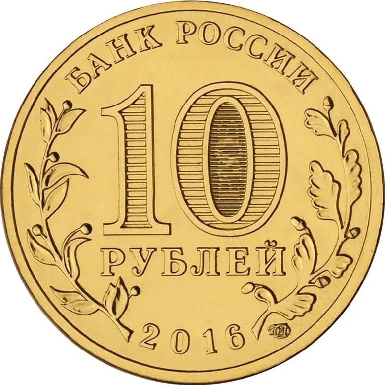 The obverse features the circumferential inscriptions "БАНК РОССИИ" (top) and "2016" (bottom), with stylized laurel (left) and oak (right) branches. The central disc displays the face value "10 РУБЛЕЙ". Inside the '0' is a hidden protective element showing "10" and "РУБ" when tilted. The mint mark is at the bottom.