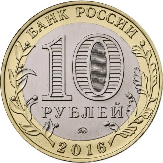 The obverse features the circumferential inscriptions "БАНК РОССИИ" (top) and "2016" (bottom). Stylized laurel and oak branches flank the outer ring, extending onto the center disc. The disc displays the face value "10 РУБЛЕЙ" in two lines; the '0' contains an angled-view security element with "10" and "РУБ". A mint mark is at the disc's bottom.
