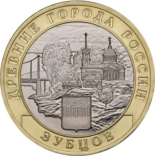 A relief panorama of Zubtsov (Tver region) is in the disc's center, with the town's emblem below. Around the ring, the inscriptions read "ДРЕВНИЕ ГОРОДА РОССИИ" (ANCIENT TOWNS OF RUSSIA) above and "ЗУБЦОВ" (ZUBTSOV) below.
