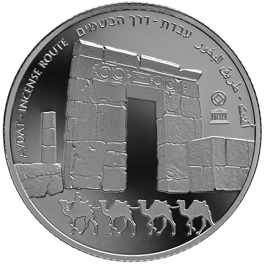 "Israel" in English, Hebrew, and Arabic, face value, mint year, state emblem, and a five-camel train.