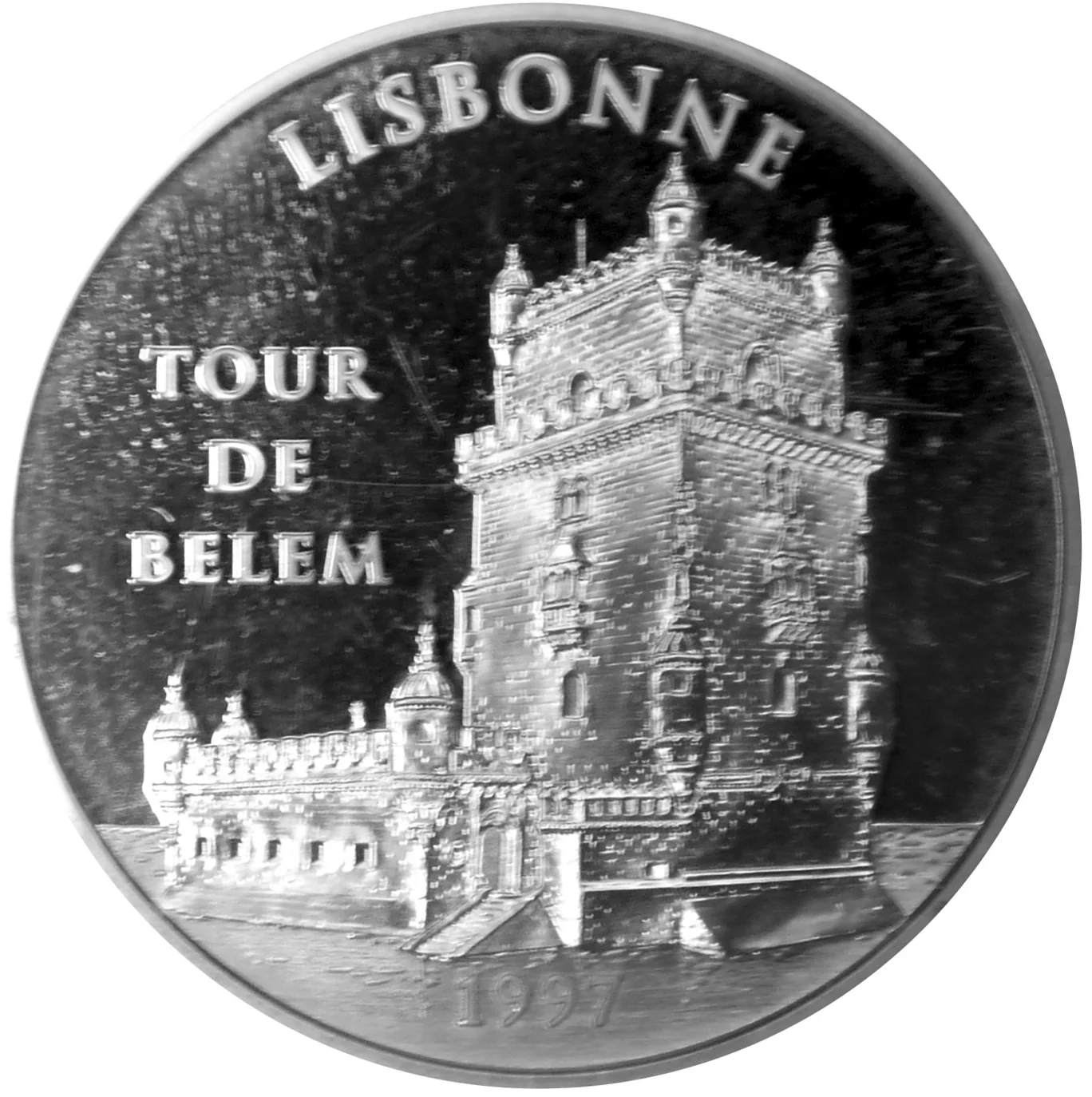 Circular legend left on three lines. Center: Belém Tower on Tagus River, guarding Lisbon's harbor. Date below.