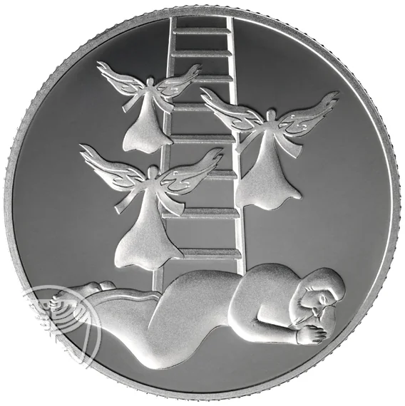 Face value and Israel's emblem. "Israel" in three languages. Depicts Jacob's dream ladder with "Jacob's Dream" inscribed in English, Hebrew, and Arabic.