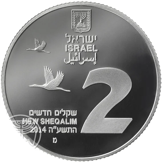 Face value, Israel emblem, "Israel" in three languages, mint year and mark, two flying cranes.