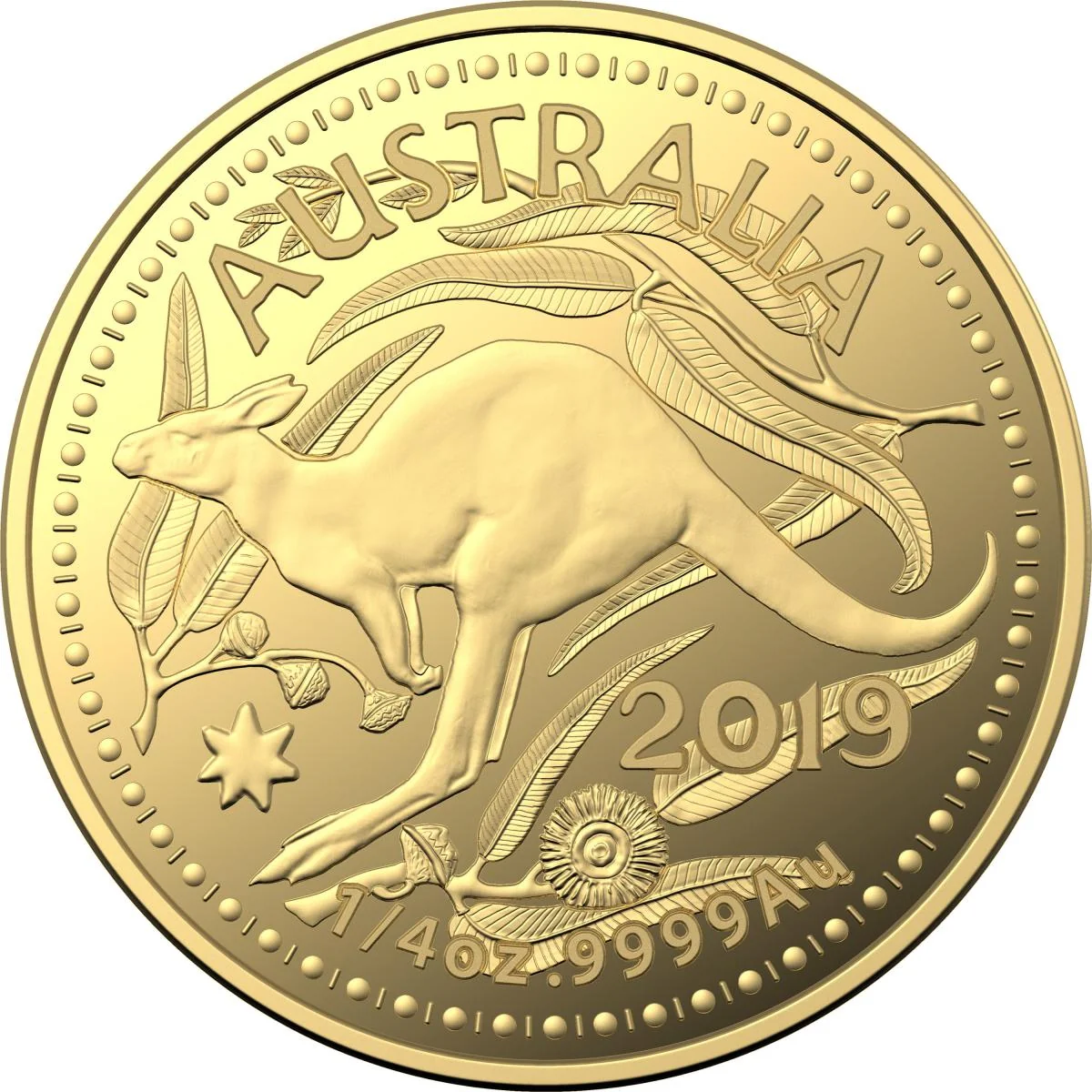 Australian penny design featuring a bounding kangaroo, Commonwealth Star, and Tasmanian Blue Gum leaves, nuts, and flowers.
