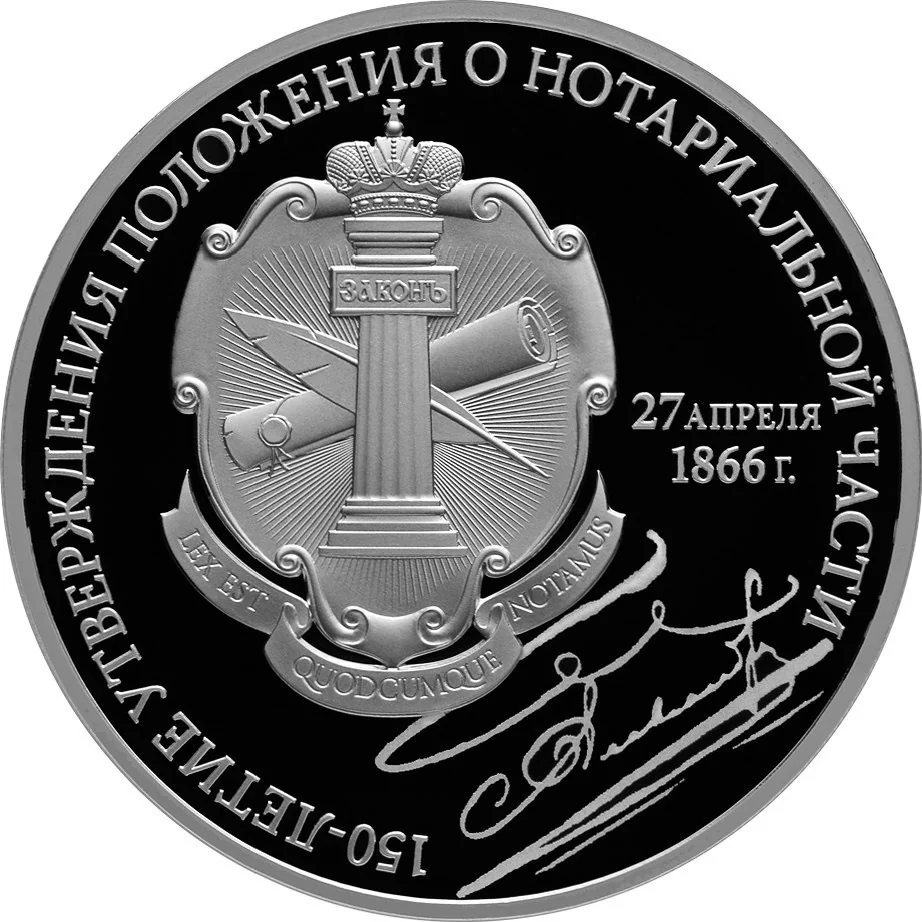 Left: emblem of the Federal Notarial Chamber. Right: the approval date "27 АПРЕЛЯ 1866 г." Above the emblem: facsimile of Alexander II's signature. Rim inscription: "150-ЛЕТИЕ УТВЕРЖДЕНИЯ ПОЛОЖЕНИЯ О НОТАРИАЛЬНОЙ ЧАСТИ".