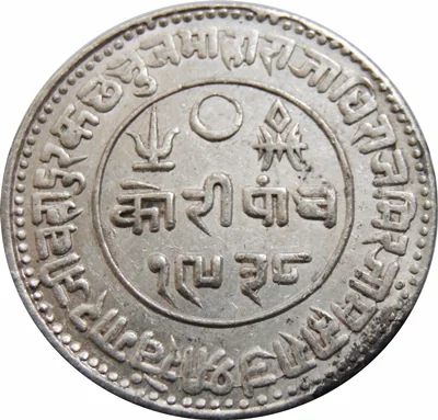 Description: Like Y#37.1 with more space inside circle. Design: Trident, closed crescent, dagger. Inner legend: "Kori Paanch/1938 VS". Outer legend: "Maharaja Dhiraj Mirza Maharao Shri Khengarji Bahadur Kutch Bhuj". All within beaded circle.