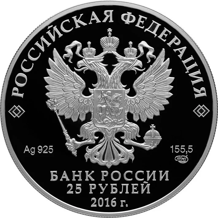 The obverse features the Russian Federation coat of arms with "РОССИЙСКАЯ ФЕДЕРАЦИЯ" above, framed by doubled rhombuses. Below are the metal specifications and mint mark. The bottom center reads "БАНК РОССИИ", "25 РУБЛЕЙ", and "2016 г."