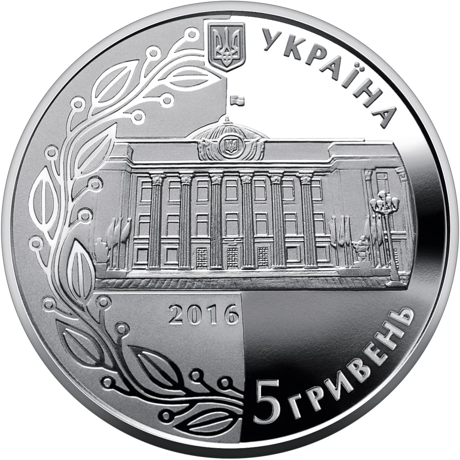 Ukraine's small coat of arms is above, with УКРАЇНА to its right. The center features the parliament building with a left floral ornament, the 2016 issue year below it, and the face value 5 ГРИВЕНЬ along the bottom.