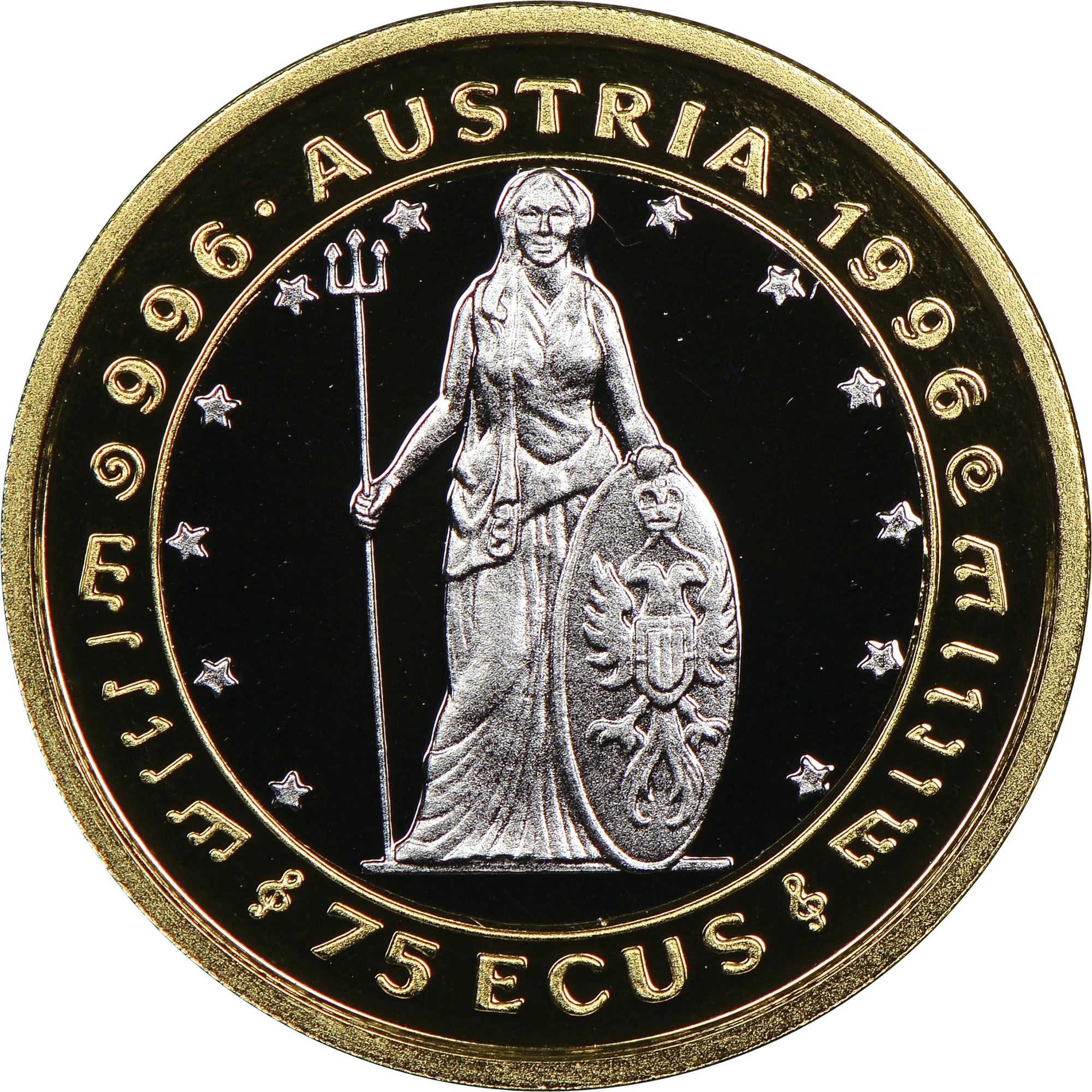 Austrian coat of arms held by a female figure, encircled by EU stars.