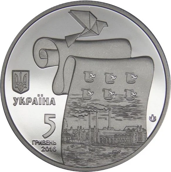 A roll of banknote paper features the Malyn Paper Mill, founded in the late 19th century, above a stylized paper bird. To the left are Ukraine's small coat of arms, the text "УКРАЇНА", the denomination "5 ГРИВЕНЬ", the year 2016, and the NBU mint mark.