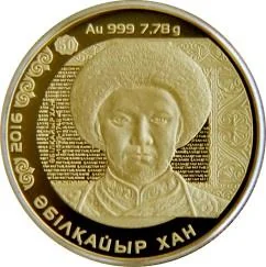 Description: The central coin design features a fragment of the 50-tenge banknote portrait of Abulkhair Khan. Encircling it are the state language inscription "ӘБІЛҚАЙЫР ХАН", the issue year "2016", and graphic elements from the banknote. The top bears the inscription "Au 999 7,78 g", indicating the metal, standard, and weight.