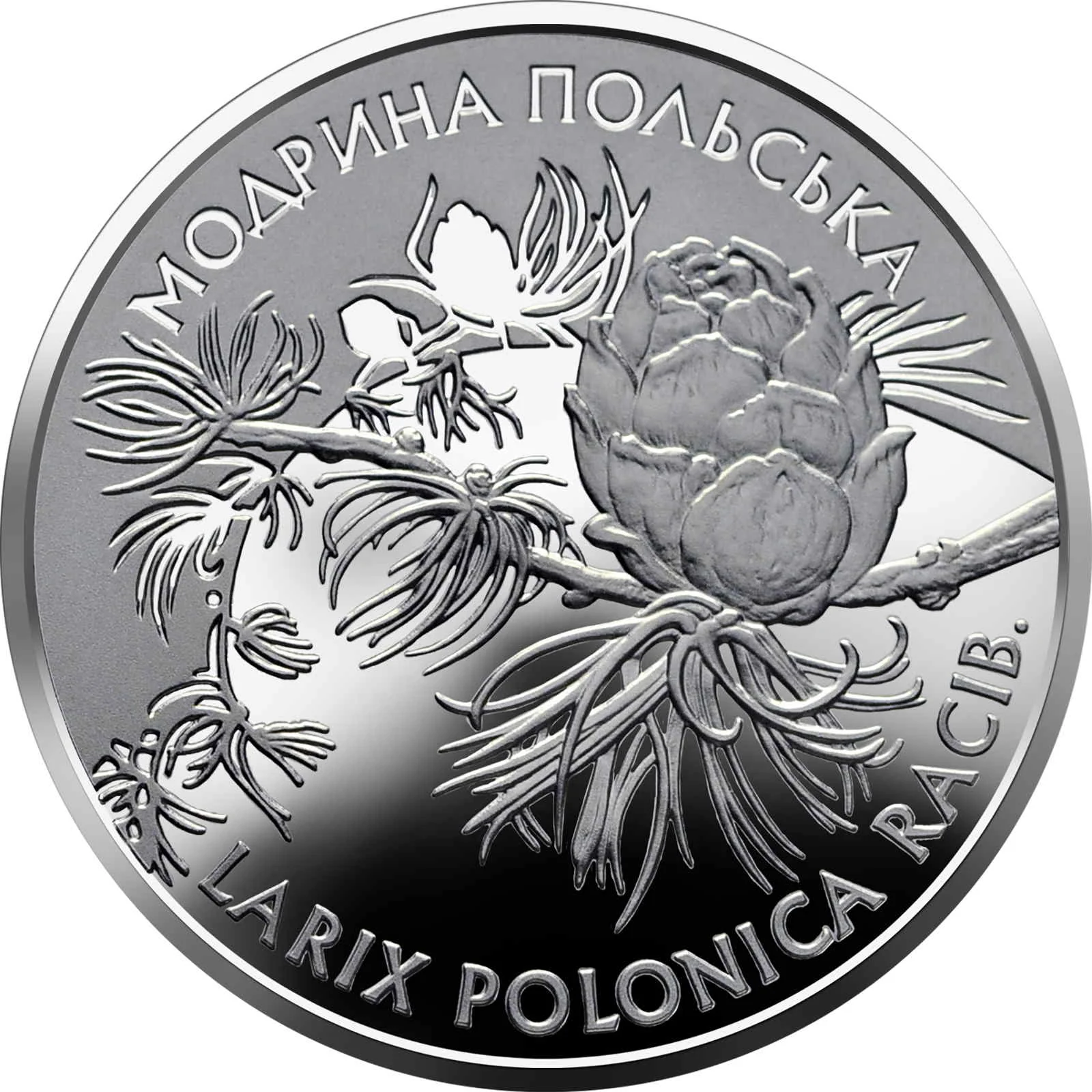 A pine branch with a cone, encircled by the inscriptions: "МОДРИНА ПОЛЬСЬКА" above and "LARIX POLONICA RACIB" below.