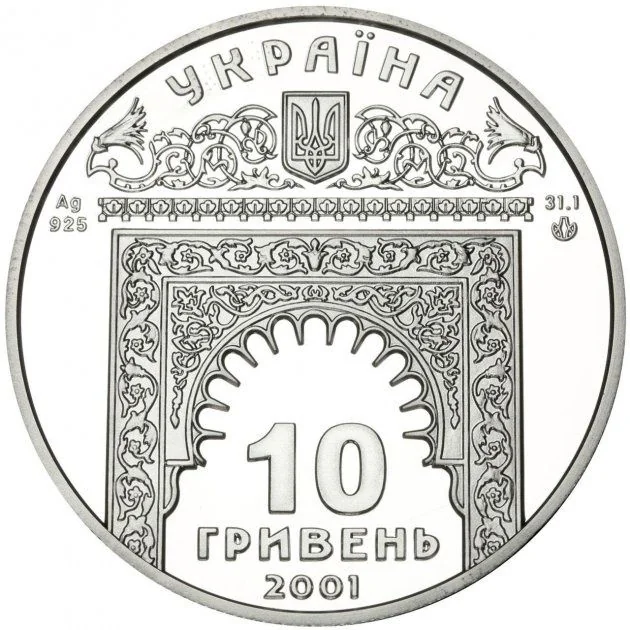 The coin features the Golden Fountain (1733) within an oriental ornament frame, including Ukraine's small National Emblem, a fragment of a marble fountain plate, and the inscriptions: УКРАЇНА / 10 / ГРИВЕНЬ / 2001, along with the metal specifications and the Mint logotype of the National Bank of Ukraine.