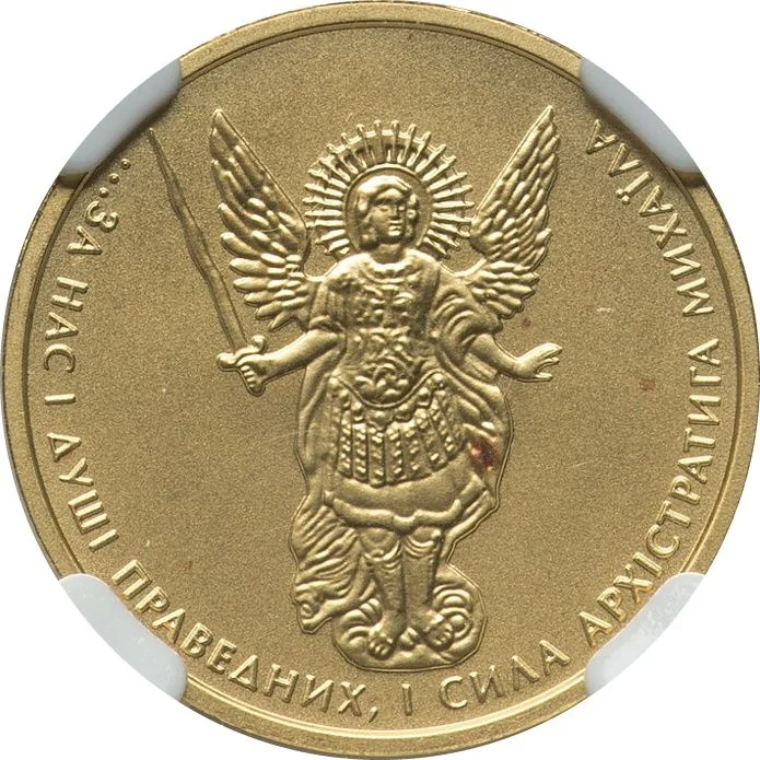 The Taxiarch Archangel Michael (Archistrategos), a patron of warriors and the suffering. The circular inscription, from Shevchenko's "Haydamaks," reads: "FOR US AND SOULS OF RIGHTEOUS MEN, AND ARCHISTRATEGOS MICHAEL'S STRENGTH."