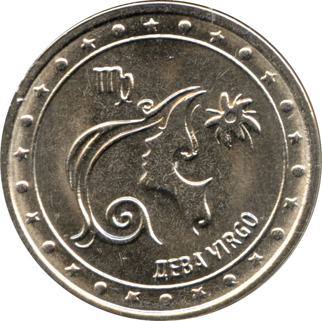 Center: stylized Virgo symbol. Below: circular inscription "ДЕВА VIRGO".