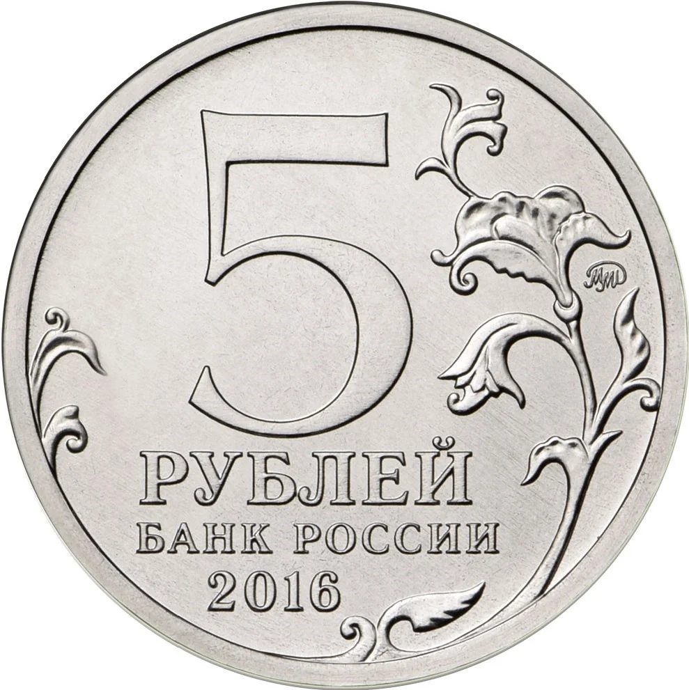 The center features "5 РУБЛЕЙ" above "БАНК РОССИИ" and "2016". A stylized plant twig extends left and right, with the mint mark near the rim.