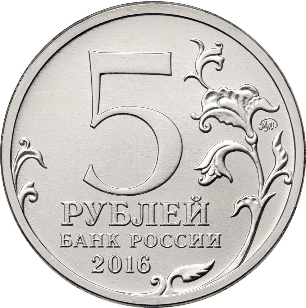 The center features "5 РУБЛЕЙ" above "БАНК РОССИИ" and "2016". A stylized plant twig extends left and right, with the mint mark near the rim.