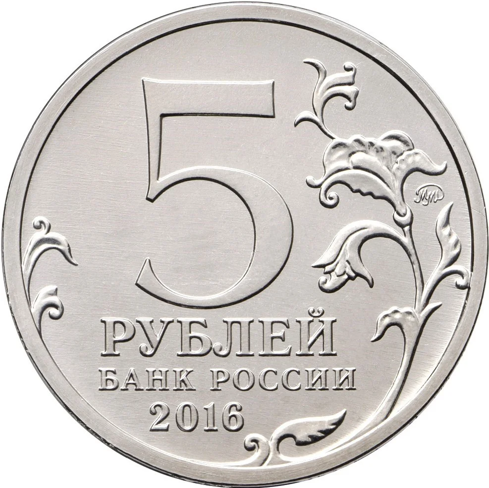 The center features "5 РУБЛЕЙ" above "БАНК РОССИИ" and "2016". A stylized plant twig extends left and right, with the mint mark near the rim.