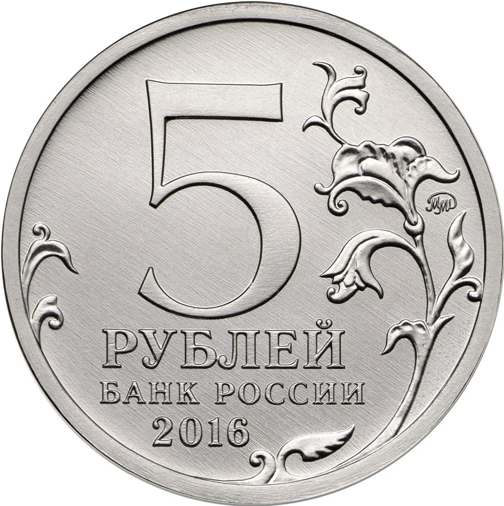 The center features "5 РУБЛЕЙ" above "БАНК РОССИИ" and "2016". A stylized plant twig extends left and right, with the mint mark near the rim.