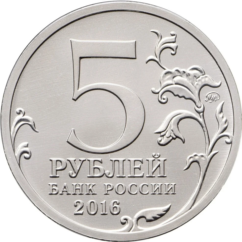 The center features "5 РУБЛЕЙ" above "БАНК РОССИИ" and "2016". A stylized plant twig extends left and right, with the mint mark near the rim.