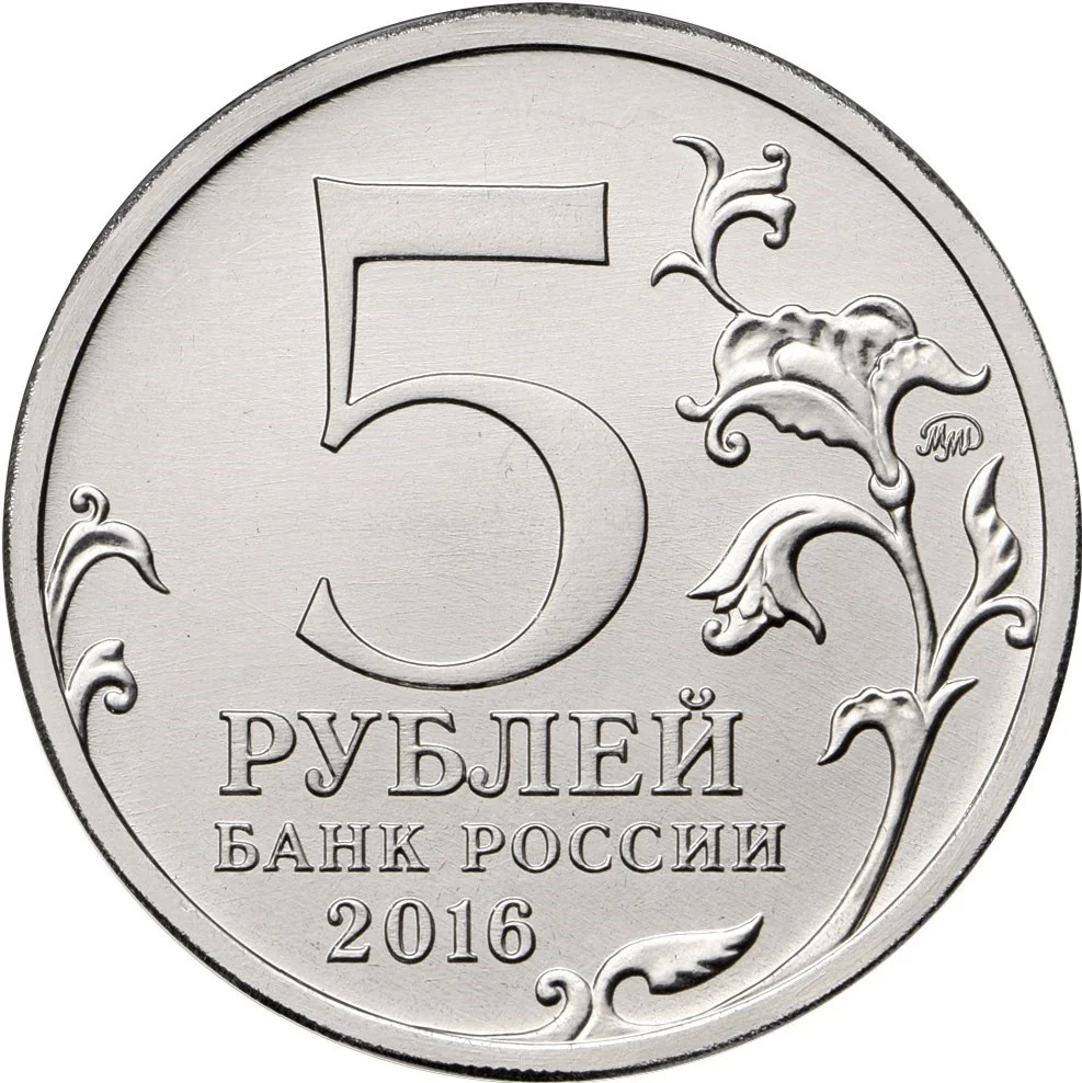 The center features "5 РУБЛЕЙ" above "БАНК РОССИИ" and "2016". A stylized plant twig extends left and right, with the mint mark near the rim.
