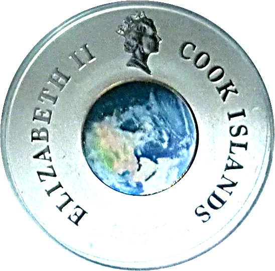 Earth globe with Queen Elizabeth II profile, inscribed "Elizabeth II, Cook Island, 1 Dollar 1 oz .999 Silver 2009."