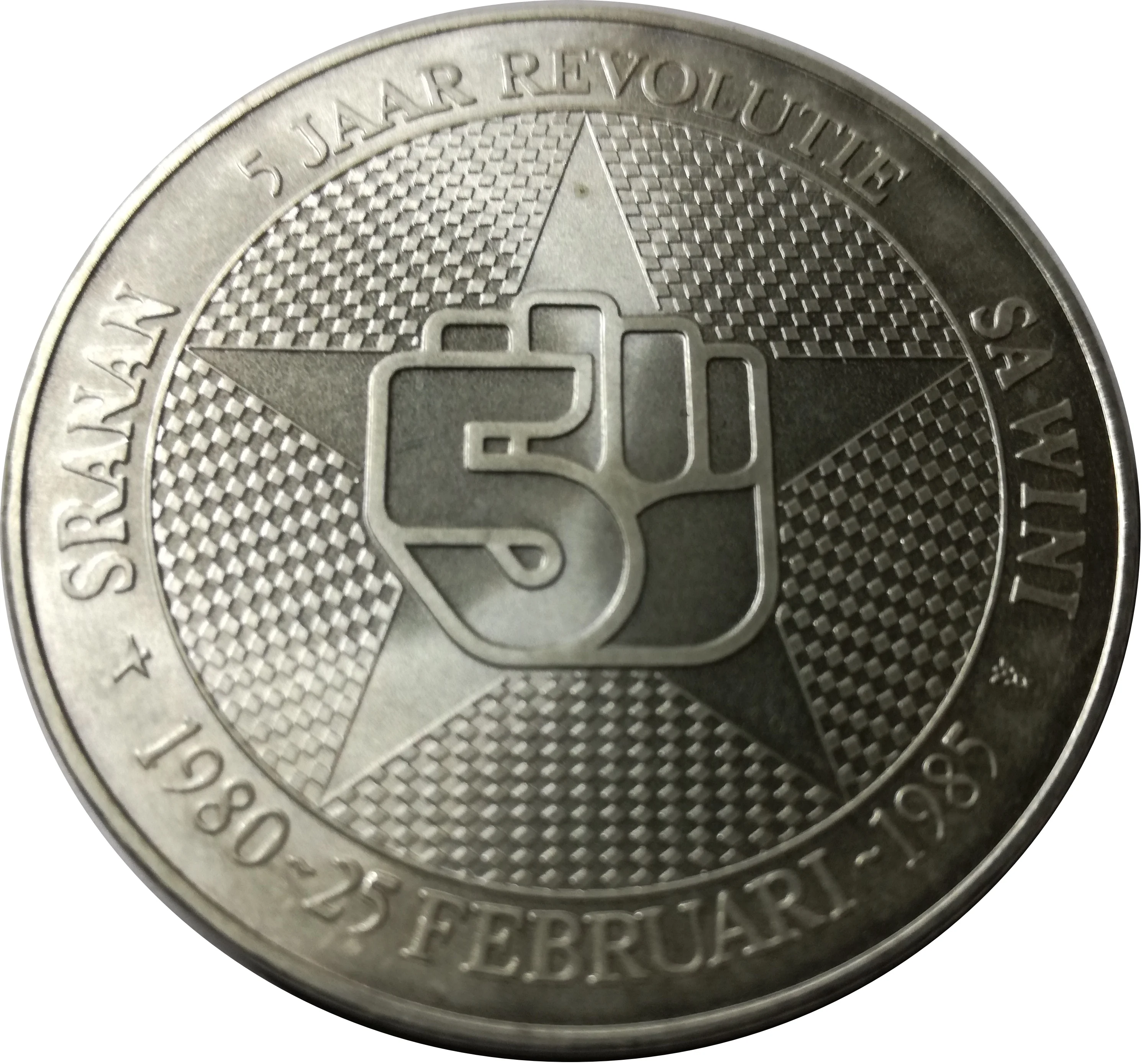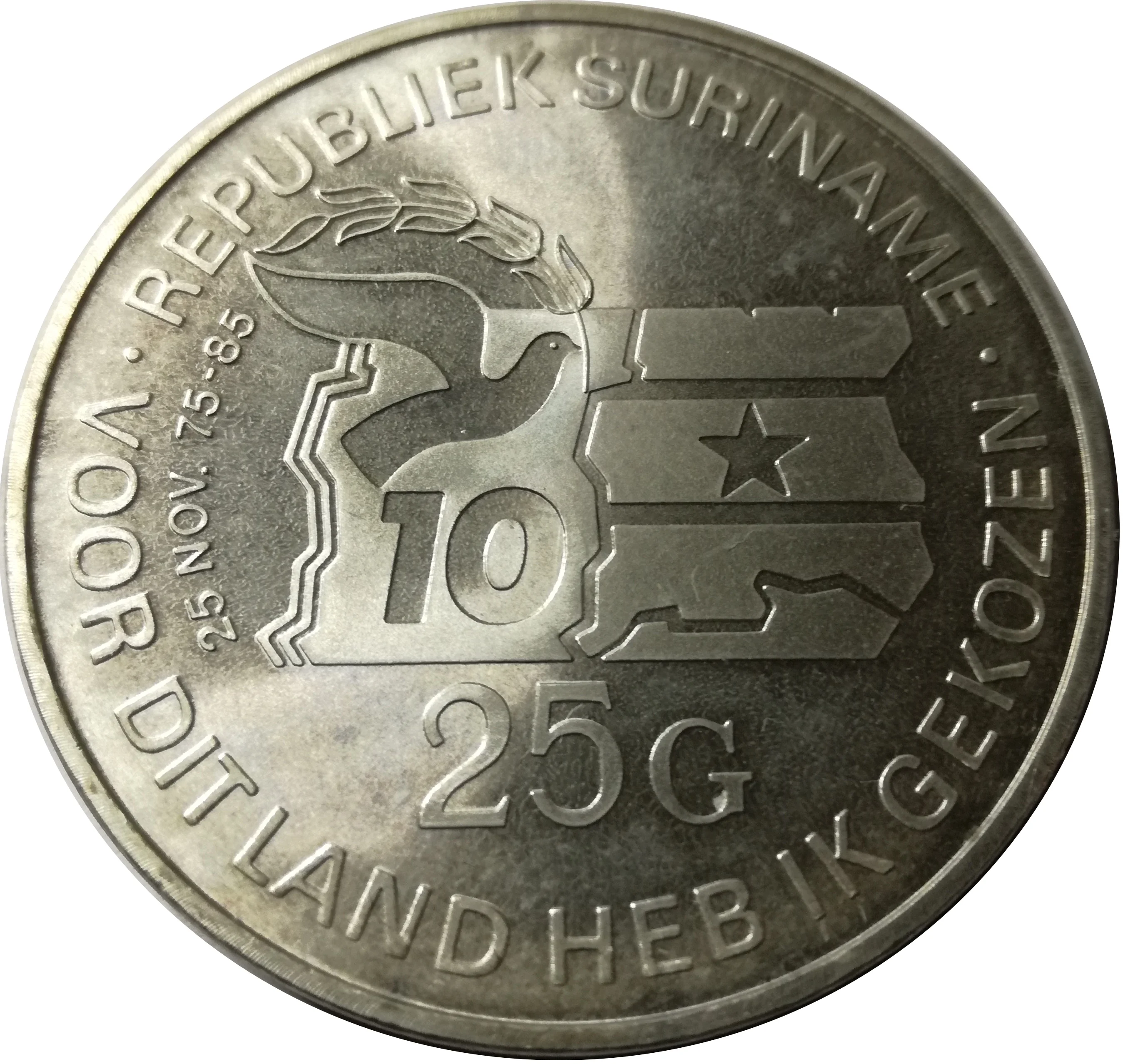 Description: Peace dove with branch before Surinamese flag above denomination. "10" below dove for independence anniversary. Encircling text.