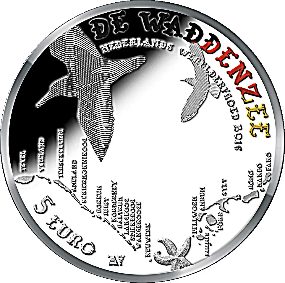 Aerial Wadden Sea view with Dutch, German, and Danish islands, labeled. Seabirds and a starfish. Text above. Value, mint and privy marks below.