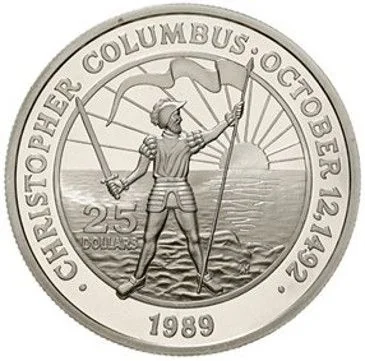 Columbus plants a flag, sword in hand, with sunlit sea behind him.