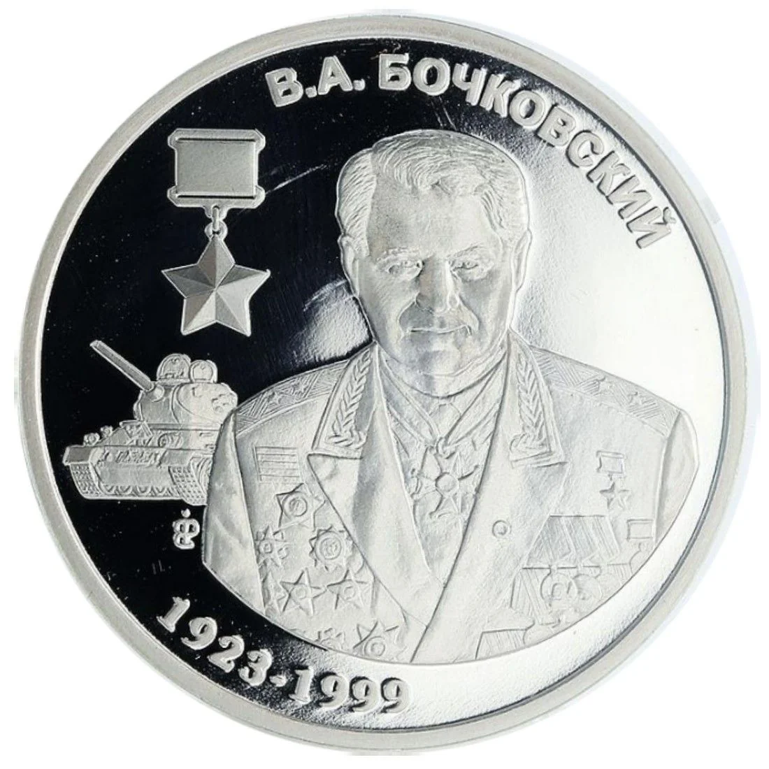 Portrait of Hero of the Soviet Union V.A. Bochkovskiy, with a tank and Gold Star medal to the left, and his lifespan "1923-1999" below.